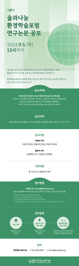 재단법인 숲과나눔은 오는 11월 11일과 12일 양일간 연세대학교 백양누리에서 '제7회 숲과나눔 환경학술포럼'을 개최하며, 이를 앞두고 연구논문 공모를 진행한다고 밝혔다.숲과나눔 환경학술포럼은 환경·안건·보건 분야 문제 해결을 위한 연구 교류와 사회적 협력을 위해 매년 개최되는 학술 행사로 ▲기후위기 ▲탄소중립 ▲자원순환 ▲산업보건 ▲노동안전 ▲환경보건 ▲생물다양성 ▲환경교육 ▲환경커뮤니케이션 ▲화학물질 ▲에너지 ▲대기 ▲물 ▲해양 ▲폐기물 ▲환경운동 사례 ▲남북협력 등 환경·안전·보건 전반을 아우르는 폭넓은 주제의 연구를 공유한다.