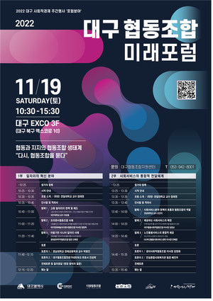 대구광역시 사회적경제지원센터를 위탁 운영하는 (사)커뮤니티와경제와 대구지역 협동조합 이사장 조찬 간담회 운영위원회가 공동으로 '2022 협동조합 미래포럼'을 개최한다. '협동과 지지의 협동조합 생태계-다시, 협동조합을 묻다'를 주제로 열리는 이번 포럼은, 1부에서 '일자리 혁신 분야'를 2부는 '사회서비스 통합적 전달 체계'를 다룬다. 세부 내용으로는 대구지역 협동조합 생태계 활성화를 위해 지역사회의 일자리 환경을 혁신으로 이끌어가는 협동조합 모델과 돌봄과 같은 사회서비스의 통합적 제공의 협동조합 실천사례를 통해 분야별 협동조합 성