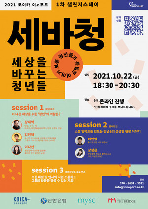 한국국제협력단 KOICA(이하 코이카)가 주최하고 신한은행이 후원하며, 사단법인 더 브릿지(이하 더 브릿지)와 주식회사 엠와이소셜컴퍼니(이하 MYSC)가 주관하는 온라인 토크 콘서트 '제1차 챌린저스데이:세상을 바꾸는 청년들'이 오는 22일 개최된다.코이카 이노포트는 글로벌 개발협력 이슈를 해결하려는 청년들과 예비·초기 창업가를 위한 사회혁신허브(Innovation Hub for Development) 사업으로, 2020년 3월부터 시작된 코이카 프로그램이다. 올해는 여러 사회 문제를 정의하고 솔루션을 찾는 '사회혁신 실험실'이라는