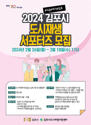 김포시가 '2024년 김포시 도시재생 서포터즈(이하 도시재생 서포터즈)'를 모집한다.도시재생 서포터즈는 다양한 도시재생사업을 홍보하고 시민들의 이해와 관심을 도모하기 위해 마련됐다. 모집 기간은 2월 26일부터 3월 18일까지이며, 도시재생에 관심이 있는 김포 시민 및 생활권자라면 누구나 지원 가능하다.도시재생 서포터즈는 5명 내외로 선발되며 ▲김포시 도시재생사업 취재 및 기사 작성 ▲도시재생 활동 참여 및 수기 작성 ▲아이디어 기획 회의 등의 활동을 하게 된다.또한 기사 및 콘텐츠 작성 건에 대해 소정의 활동비가 지급되며, 주요