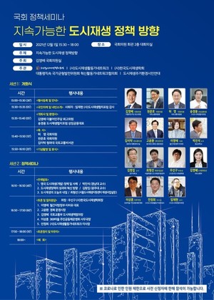 도시재생 뉴딜정책의 제도개선 방안을 모색하는 자리가 마련된다.(사)도시재생협치포럼은 12월 1일 국회의원회관 2층 대회의실에서 '지속가능한 도시재생 정책 방향' 국회 정책세미나를 개최한다고 밝혔다.이번 국회 정책세미나를 주최한 김영배 더불어민주당 최고위원은 "도시재생뉴딜사업이 5년차를 맞이하는 이 시점에 '지속가능한 도시재생 정책방향' 모색을 위한 국회 정책세미나를 주최할 수 있게 돼 감회가 새롭고, 이번 국회 정책세미나를 통해 도시재생 정책이 나아갈 길을 제시할 수 있기를 기대한다"고 말했다.행사를 주관한 (사)도시재생협치포럼의