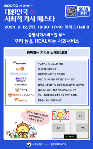 중앙사회서비스원은 오는 12일 서울 코엑스에서 개최되는 '제1회 대한민국 사회적 가치 페스타'에서 사회서비스 오감 체험 부스를 운영한다고 밝혔다.중앙사회서비스원은 2022년 온라인 타운홀 미팅에서 국민 삶 곳곳에 스며들어 있는 사회서비스를 "우리 삶을 힐(HEAL)하는 사회서비스"로 정의한 바 있다. HEAL은 우리 삶을 치유(Healing)한다는 의미와 함께, 보건·의료(Health), 환경(Earth), 전 생애 복지서비스(Age), 주거·돌봄·문화·여가(Living) 등 우리 삶의 다양한 영역을 아우르는 사회서비스를 제공한다는