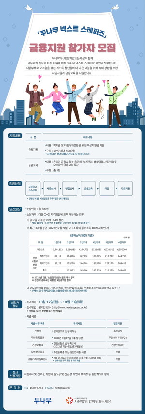 함께만드는세상(사회연대은행)이 블록체인 및 핀테크 전문 기업 두나무와 학자금 및 생활비, 전월세 보증금 등의 다중 채무로 자립 기반이 악화되는 저소득 청년들을 위해 '넥스트 스테퍼즈(Next Steppers)' 금융 지원 사업을 추진한다.지원 대상은 만 19세에서 34세 청년 중, 대부 업체를 포함한 금융회사에 다중 부채가 있고, 미래 설계에 대한 적극적인 의지가 있는 저소득 청년 600명이다.선발된 청년에게는 1인당 최대 500만 원을 지원하며 신용 및 부채 관리, 생활 금융 사기 관리 등 재무 건전성을 높일 수 있도록 온·오프라