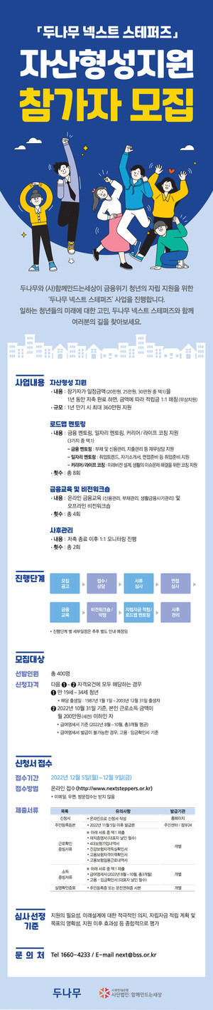 사회적 금융 선도 기관인 (사)함께만드는세상(사회연대은행)이 블록체인 및 핀테크 전문 기업 두나무와 함께 저소득 근로 청년들을 위한 '넥스트 스테퍼즈(Next Steppers)' 자산형성 지원사업을 추진한다.지원 대상은 만 19세에서 34세 근로 청년 중 월 소득이 200만 원 이하이면서 미래 설계에 대한 적극적인 의지가 있는 400명이다. 이들에게 저축액과 동일 금액을 매칭 지원하고 멘토링, 비전 워크숍 등 자립 역량을 강화할 수 있는 다양한 기회도 함께 제공한다.선발된 청년들은 본인 명의의 신규 적금 개설 후 매월 일정 금액(2