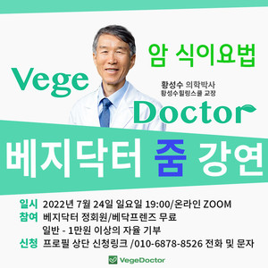 식물식을 실천하는 의사들의 모임 ‘베지닥터(VegeDoctor)’가 ‘암 식이요법’이라는 주제로 24일 온라인 강연을 열었다.이 날 강연은 ‘황성수’ 의학박사가 맡았으며, 황 박사는 전직 의사였으며 식이요법과 건강한 생활습관을 교육하는 ‘힐링스쿨’의 원장이다.황 박사는 현재 국내 암 발생 현황에 대해 설명하며 강연을 시작했다. 한국인 원인별 하루 사망자수는 암에서 제일 높게 나타났고, 일생동안 암에 걸릴 가능성은 35%에 달한다. 암 발생이 빈번하고 그 추세도 꾸준히 증가하고 있기 때문에 암에 대한 두려움도 높아지고 있다. 이 현상