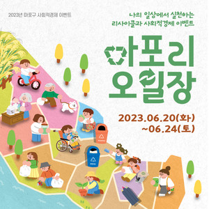 마포구 사회적경제통합지원센터에서(이하 센터)는 6월 20일부터 6월 24까지 '나의 일상에서 실천하는 리사이클과 사회적경제'라는 슬로건 아래 마포구 사회적경제 이벤트 '마포리 오일장'을 개최한다.'마포리 오일장'에서는 자신만의 쓰레기 줄이기 방법을 SNS에 공유하는 제로웨이스트 실천하기(Zero Waste Challenge), 재활용되지 않는 쓰레기를 모으는 자원순환에 참여하기(Recycling), 모두를 위한 가치 있는 소비하기(Buy Social), 멸종위기 동물 컬러링북 색칠하며 모든 생명 존중하기(Save the Earth)