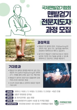 국제맨발걷기협회가 맨발걷기 전문지도자 과정 참가자를 모집한다.이번 과정은 2월 15, 16, 22, 23일 총 4일간 성동구 한양광장 강의실에서 진행된다. 프로그램 참가 비용은 45만 원이며, 교육내용은 맨발걷기의 철학과 원리, 어싱(earthing)의 과학적 이론부터 실전 지도법까지 총 35시간의 이론과 실습으로 구성된다.2020년부터 서울숲 맨발걷기학교를 운영해 온 국제맨발걷기협회는 현재까지 약 5,000명의 참가자에게 맨발걷기의 경험을 제공해 왔다. 매주 토요일 서울숲 야외무대에서 프로그램이 진행된다.김도남 국제맨발걷기협회장은