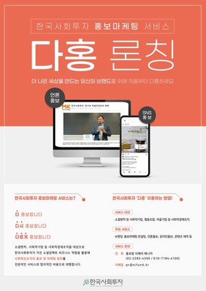 한국사회투자가 포스트 코로나 시대를 대비해 소셜벤처, 사회적경제조직을 위한 언택트 홍보 마케팅 서비스 '다홍'을 론칭했다고 14일 밝혔다.'다홍'은 한국사회투자가 가진 역량을 활용해 소셜벤처와 사회적경제조직의 홍보 및 마케팅 업무를 대행하기 위해 만들어졌다. 주요 서비스는 ▲브랜딩·홍보마케팅 컨설팅 ▲실무 교육 ▲언론 홍보 ▲온라인 홍보(채널 운영) ▲콘텐츠 및 홍보물 제작 등이다.코로나19 확산 이후 대부분의 기업 매출에서 온라인과 모바일 시장이 차지하는 비중이 급증하고 있다. 이에 대기업, 중소기업뿐 아니라 많은 스타트업도 언택