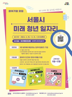 서울시가 신성장 산업에 특화된 '미래 청년 일자리' 사업을 통해 2024년 청년 일자리 500개를 창출하겠다고 밝혔다.'미래 청년 일자리' 사업은 쉽게 접근하지 못했던 신성장 분야 기업에서 6개월간 일하면서 경력을 쌓을 수 있도록 기업과 청년 구직자를 연계하는 사업이다.올해 3기를 맞이하는 '미래 청년 일자리 사업'은 미래변화를 주도할 신산업 중 ▲ 온라인콘텐츠 ▲ 제로웨이스트 ▲ 소셜벤처 3개 분야, 190개 기업과 청년구직자 500명을 각각 선발하여 배치할 계획이다.청년들은 선발 과정을 거쳐 올해 6월 중순 참여기업에 배치되며,