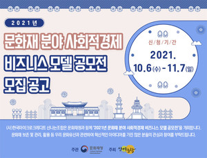 문화재청은 문화재 분야의 사회적경제 활성화를 위해 우수한 창업 종목과 혁신적인 공공비즈니스 유형을 발굴‧공유하고자 '2021년 문화재 분야 사회적경제 비즈니스모델 공모전'을 10월 6일부터 11월 7일까지 시행한다.이번 공모전은 문화재형 예비사회적기업에 적합한 사업유형 또는 실현 가능한 사업 종목들을 보유하고 있는 신규 창업준비자(개인·기업 포함)들과 기존의 창업기업을 대상으로 한다. 모집 분야는 '보존·관리형', '활용형', '기타형' 등 3분야다.공모전에 제출할 기획안은 지속가능한 문화유산 보존관리와 문화산업 활성화에 이바지하는