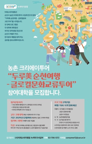 (사)미래소비자행동이 순천시 농촌크리에이투어사업 추진단과 업무협약을 맺고 올해 '두루美 순천여행-글로컬문화교류투어' 프로그램(이하 두루美 순천여행)을 시범 운영한다.두루美 순천여행은 제로웨이스트 생태 투어(흑두루미 따라 순천 한바퀴), 명인과 함께 순천맛기행, 헬스 앤 힐링 투어(육심 다스림 프로잭트) 등 순천시에서 농촌과 먹거리 및 다양한 지역문화를 체험하는 여행 프로그램이다. 이 중 미래소비자행동은 글로컬 문화 교류 투어를 맡아 운영할 예정이다.글로컬 문화 교류 투어는 외국인 유학생과 국내 청년이 1박2일간 문화 교류 캠프를 함