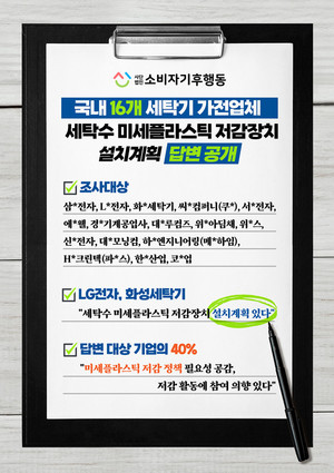 (사)소비자기후행동은 5일 삼성, LG 등 16개 가전업체에 공개 질의한 '세탁수 미세플라스틱 저감장치 설치 계획' 답변을 공개했다.가정용 세탁기 제조사인 LG전자, 씨엔컴퍼니(쿠잉), 서울전자, 에코웰, 상업용 세탁기를 만드는 화성세탁기, 경북기계공업사 등이 이번 질의에 답변했다. 가정용 세탁기를 제조판매하는 LG전자와 상업용 세탁기 업체인 화성세탁기는 미세플라스틱 저감 장치를 설치할 계획이 있다고 답변했으며, 질의대상 기업 중 약 40%는 미세플라스틱 저감 정책 필요성에 동의, 저감 행동에 동참하겠다는 입장을 밝혔다.이번 답변에