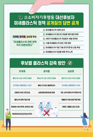 (사)소비자기후행동(이하 소비자기후행동)이 지난 달 27일 대선후보자 4인(더불어민주당 이재명 후보, 국민의힘 윤석열 후보, 정의당 심상정 후보, 국민의당 안철수 후보)에게 보낸 '미세플라스틱 정책 공개질의'에 대한 답변을 23일 공개했다.이재명, 윤석열, 심상정 후보는 미세플라스틱 문제의 심각성에 공감하며 관련 법안을 적극 마련하겠다는 의지를 밝혔다. 안철수 후보는 "미세플라스틱 문제에는 공감한다"고 밝혔으나 관련 답변서는 보내지 않았다.소비자기후행동 이차경 공동대표는 "미세플라스틱이 국민 건강과 직결되는 시급한 문제임에도 대선