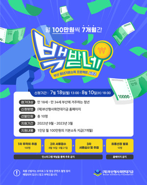 (재)부산형사회연대기금(이하 '재단')은 작년에 이어 '부산 청년기본소득 프로젝트 시즌2'(타이틀명, '백받네')를 시작한다고 18일 밝혔다. 지난해(2021년) 민간 최초로 부산MBC와 함께 청년기본소득 프로젝트를 진행한 데 이어 올해는 재단이 단독으로 진행한다. 작년에는 신청자 약 3,000명 가운데 무작위추첨과 심사과정을 통해 총 14명을 선발하였던 반면, 올해는 작년과 같은 방식으로 선정된 10명의 청년들과 함께 청년기본소득을 실험하게 된다. 부산에 거주하는 만 18세~만 34세의 청년이면 누구나 참여 신청할 수 있다. 자세