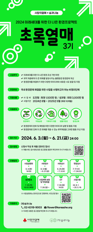 재단법인 숲과나눔과 사랑의열매 사회복지공동모금회는 '미래세대를 위한 더 나은 환경 프로젝트 4기' (이하 '초록열매') 참여 단체를 공개 모집한다고 25일 밝혔다.'초록열매'는 기후위기, 환경오염, 생물다양성 감소 등 다양한 환경 문제 해결을 위한 창의적 프로젝트를 지원하는 공모사업이다. 특히 성장 가능성이 높은 신생 단체 및 소규모 비영리단체를 우선 지원하여, 장기적으로 독립적이고 지속 가능한 환경 활동 역량을 갖추도록 돕는 것이 목표다. 2021년 사업이 시작된 이래 지금까지 총 56개 단체의 71개 프로젝트를 지원
