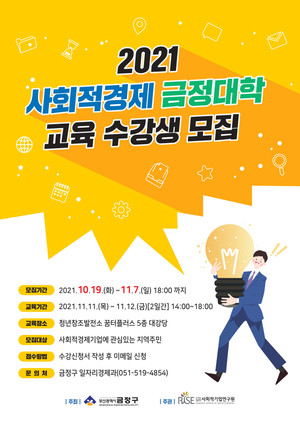 부산 금정구는 사회적경제기업에 대한 이해를 돕고 지역 사회적경제기업가를 육성하기 위한 '2021 사회적경제 금정대학' 수강생을 내달 7일까지 모집한다고 밝혔다.'사회적경제 금정대학'은 ▲사회적경제의 기본 이해 ▲소셜 미션 및 비즈니스 모델 탐색 ▲사회적경제기업 제품 체험 등 다양한 내용으로 구성되어 내달 11일부터 12일까지 이틀간 청년창조발전소 꿈터플러스에서 진행된다.사회적경제기업에 관심 있는 시민이면 누구나 참여 가능하며 모집 인원은 20명으로 금정구 주민을 우선 선발한다. 오는 7일까지 금정구 또는 (사)사회적기업연구원 홈페이