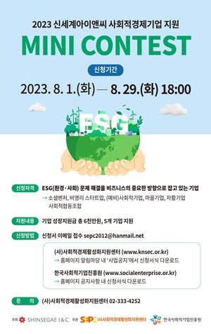 신세계아이앤씨와 한국사회적기업진흥원, (사)사회적경제활성화지원센터는 혁신적 아이디어를 가진 사회적경제기업을 지원하는 'MINI CONTEST'를 개최한다. 이번에 9회째를 맞는 MINI CONTEST는 사회·환경 문제 해결을 위한 사회적경제 성장 지원 프로그램이다. 또한 창의적인 설루션 활용과 혁신을 창출하기 위해 기업의 자율성을 해치지 않도록 지원금 운용의 불필요한 제약과 절차를 최소화해 참여 기업의 자율성을 최대한 보장한다는 특징이 있다. 신청 자격은 ESG(환경·사회) 문제 해결을 비즈니스의 중요한 방향으로 잡고 있으며, ▲소