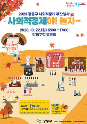 서울 강동구는 오는 22일 정오부터 강동구청 열린뜰에서 2023년 사회적경제주간 기념행사 '사회적경제야! 놀자'를 개최한다.우천으로 인해 한차례 연기되었던 이번 행사는 '가치가게 같이강동'이라는 슬로건으로 지역주민들에게 사회적경제의 의미와 가치를 알리고, 사회적경제기업 종사자들간의 소통과 화합을 위해 마련됐다.강동구와 강동구 사회적경제지원센터가 주관하는 이번 행사에서는 ▲마술공연 ▲유공자 표창 ▲주민과 함께하는 박 터트리기 ▲버블공연 ▲팝페라공연 등 다채로운 프로그램이 진행될 예정이다.또한, 행사장 상설부스에서는 관내 사회적경제기업