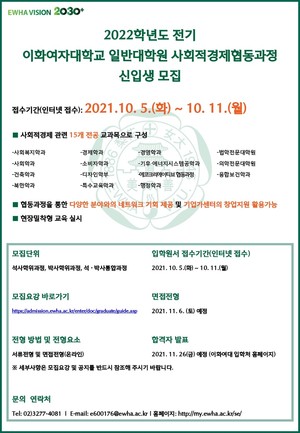 이화여자대학교 일반대학원 사회적경제협동과정(이하 이화여대 사경협)에서 2022년 전기 신입생을 모집한다.지난 2017년 2학기부터 운영 중인 이화여대일반대학원 석박사 과정 사회적경제협동과정은 사회복지학, 에코크리에이티브 협동과정 등 사회적경제 관련 15개 전공 교과목으로 구성돼 있다.서류 접수기간은 10월 5일부터 11일까지로, 인터넷으로 할 수 있다. 전형은 서류전형과 면접전형으로 나뉘어진다.면접은 11월 6일 예정이며, 최종합격자는 11월 26일 이화여자대학교 입학처 홈페이지에서 확인할 수 있다.자세한 사항은 모집요강 및 공지를