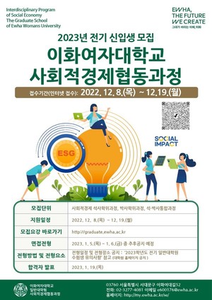 이화여자대학교 일반대학원 사회적경제협동과정에서 2023년 전기 2차 신입생을 모집한다.사회적경제협동과정은 사회적경제 분야 지식을 갖춘 글로벌 융복합형 창의 인재 양성을 위해 개설된 대학원 과정으로, 17개 전공(사회복지학과·경제학과·경영학과·사회학과·행정학과·북한학과·영상디자인·산업디자인·특수교육학과·법학과·소비자학과·건축학과·기후에너지시스템 공학과·에크크리에티브·융합보건학과·의학과·언어병리학과)과 연계되어 있다. 또한 '이화 창업아카데미', '이화 소셜임팩트 포럼'을 매년 개최하여 사회적기업가정신을 함양하고 창업에 필요한 기술을