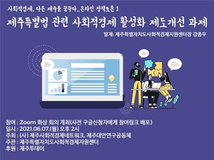 제주특별법 내 사회적경제 활성화 방안을 마련하기 위한 온라인 토론의 장이 마련된다. 제주사회적경제네트워크와 제주대안연구공동체가 주최하고 제주사회적경제지원센터가 주관하는 '다른 경제를 꿈꾸다' 정책 토론회가 6월 7일 오후 2시에 제주사회적경제센터 몬딱가공소에서 열린다. 코로나 19 상황으로 온라인 토론으로 진행되는 이번 행사는 강종우 제주사회적경제지원센터장이 발제를 맡아 제주사회적경제 현황과 함께 제주특별법 제도개선 과제를 발표한다.강종우 제주사회적경제지원센터 센터장은 주제발표를 통해 ▲사회적가치의 미래비전의 핵심 과제 반영 ▲사회