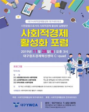 대구시와 사회적경제활성화 대구네트워크가 오는 28일 오후 3시 대구창조경제혁신센터에서 '사회적경제 활성화 포럼'을 개최한다.이번 포럼은 시민운동으로서의 사회적경제 영역에 대한 인식 확대와 사회적경제에 대한 시민의 신뢰도 향상, 민․관 거버넌스 강화를 위해 마련됐으며 시민단체, 사회적경제기업인, 소비자단체, 사회단체 등 100여 명이 참여할 예정이다.'시민운동으로서의 사회적경제'를 주제로 '사회적경제란 무엇인가'를 저술한 김기섭 박사가 주제강연을 하고, 박노광 대구경북소비자연맹정책