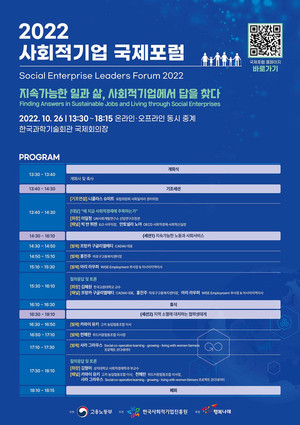 고용노동부가 추죄하고 한국사회적기업진흥원(이하 진흥원)이 주관하는 국제포럼이 개최된다. '2022 사회적기업 국제포럼'은 '지속가능한 일과 삶, 사회적기업에서 답을 찾다'라는 주제로 10월 26일 오후 1시 30분부터 온‧오프라인 동시 진행된다. 2020년과 21년에는 코로나19로 인해 현장 참가자 50명 이내의 온라인 위주 행사로 진행되었으나, 올해는 300명 규모의 오프라인 행사와 진흥원 유튜브 채널을 통해 온라인 생중계를 병행한다.기조세션에서는 기조연설을 발표할 니콜라스 슈미트 유럽위원회 사회일자리 권리위원과 빅 반 뷔렌 IL