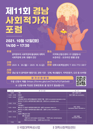 경상국립대 대학사회책임센터, 대학사회책임센터에서 제 11회 '경남 사회적가치 포럼'을 10월 12일(화)에 개최한다. 경남과학기술대학교는 2018년부터 지역연계 기반을 구축하기 위한 방안으로 '경남 사회적 책임활동 포럼'을 설립하여 지역의 공공기관, 기업, 지역사회 단체 등을 연계해 왔다. 올해 3월 경남과기대가 경상대학교와 통합되면서 경상국립대학가 됐다. 이번 포럼에서는지방정부와 협력사업의 성과를 평가하고 연계전공 교육의 내용과 방법에 대한 개선점을 발견함으로써 사회적경제 연계전공 및 사회적경제연구소, 대학의 사회적책임 지향점을