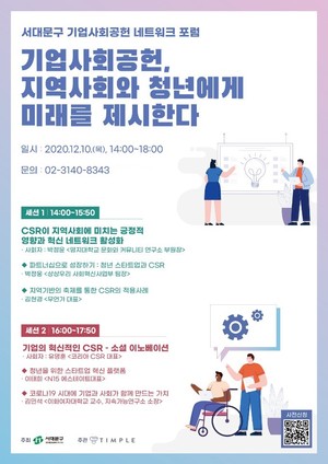 서대문구가 기업의 사회공헌사업을 지역사회에 연계하는 방안을 모색하기 위해 10일 오후 2시부터 6시까지 온라인으로 '기업사회공헌 네트워크 포럼'을 개최한다.'기업사회공헌, 지역사회와 청년에게 미래를 제시한다'라는 주제로 기업의 사회적 책임(CSR, Corporate Social Responsibility) 사례와 전략에 대해 해당 분야의 전문가들이 발제, 토론한다.첫 세션에서는 명지대 문화와 커뮤니티 연구소 박정윤 부원장이 진행하는 가운데 상상우리 사회혁신사업부 박정웅 팀장과 신촌 물총축제 등을 운영해 온 '무언가' 김현경 대표가