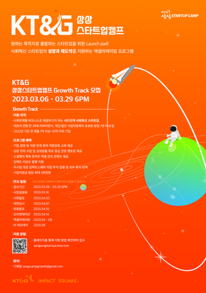 KT&G가 주최하고 임팩트스퀘어가 주관하는 사회혁신 스타트업 지원프로그램인 'KT&G 상상스타트업캠프' 7기 그로스 트랙(Growth Track)의 참여기업을 모집한다. 지난 2017년부터 진행된 상상스타트업캠프는 사회문제를 비즈니스로 해결하고자 하는 청년들의 사회혁신 스타트업 창업을 지원해왔다. 지금까지 799명을 고용했고 창업가들의 누적 매출액은 210억 원에 육박한다. 또한, 정부의 '사회적기업 육성사업'에 38개 팀이 진입하는 성과도 거뒀다.1~6기까지는 극초기 영역의 스타트업 발굴과 육성에 집중했다면 올해 모집하는 7기부터