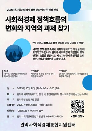 관악사회적경제통합지원센터가 오는 14일 오후 2시, 관악구청 별관 7층 강당에서 '사회적경제 정책흐름의 변화와 지역의 과제 찾기'를 주제로 관악사회적경제 활성화 포럼을 개최한다.이번 포럼은 새 정부의 사회적경제(사회연대경제) 정책 변화를 짚고, 지역 사회적경제 기업들이 변화에 대응하기 위한 전략을 함께 모색하기 위해 마련됐다. '새 정부 사회적경제 정책 변화와 관악구의 대응전략'을 주제로, 전국과 지역의 흐름을 아우르는 발제와 토론이 진행된다. 발제는 강호진 제주도사회적경제네트워크 상임이사가 맡아 국민의 정부의 사회연대경제 정책 방