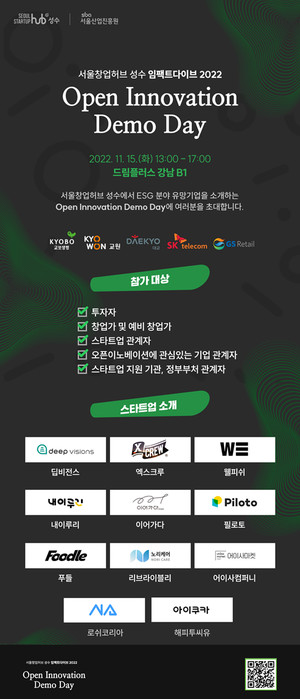 ESG 분야 유망 스타트업을 한 자리에서 만날 수 있는 '서울창업허브 성수 임팩트다이브 2022, 오픈 이노베이션 데모데이'가 11월 15일 열린다. 서울산업진흥원 서울창업허브 성수는 대·중견기업 5개 사(▲교보생명 ▲교원 ▲대교 ▲GS리테일 ▲SK텔레콤)와 오픈 이노베이션을 추진해 왔고, 이번 데모데이에서 프로그램에 참여하고 있는 ESG 분야 스타트업 11개 사의 IR 피칭을 선보인다. 또한 그간 대·중견기업과 함께 추진해 온 사업화 내용을 투자사, 협력기업 및 ESG에 관심을 두고 있는 대중 등에게 발표할 예정이다. 오픈 이노베