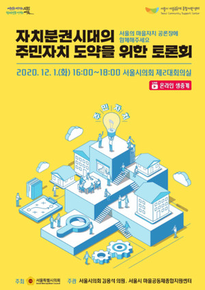 서울시의회가 주최하고 서울시 마을공동체종합지원센터와 김용석 서울시의원이 공동 주관하는 2020년 마을자치포럼 '자치분권시대의 주민자치 도약을 위한 토론회'가 12월 1일 오후 4시, 서울시의회 제2대회의실에서 개최된다.이번 토론회는 주제발표를 통해 포스트코로나 시대 지방자치 및 행정패러다임 전환의 관점에서 서울시 마을자치 정책의 의의를 진단하고 향후 서울시 마을자치정책 방향에 관한 시사점을 제시 한다.지정토론에서는 주민자치를 지원하는 특별예산의 성격을 논하고 중간지원조직의 자율성을 강조한다. 한편 주민자치회 현장의 목소리로 자치의