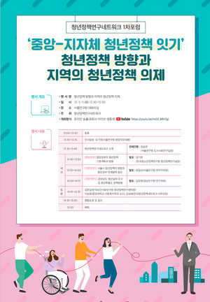 서울연구원은 11일 오후 1시 30분 서울연구원 대회의실에서 청년정책연구네트워크 1차 포럼 '중앙-지자체 청년정책 잇기'를 개최한다.이번 포럼은 지난 2월 25일 출범한 청년정책연구네트워크가 주최하는 것으로, 올해 총 3회에 걸쳐 중앙과 지역의 청년정책 연계 방안에 대한 포럼을 개최할 예정이다. 청년 현안 공유와 청년문제 해결을 위한 공동연구를 진행하는 청년정책연구네트워크는 서울연구원과 경남연구원, 한국보건사회연구원, 한국청소년정책연구원이 참여하고 있다.이번 1차 포럼은 지역과 중앙의 청년정책 연구자와 전문가