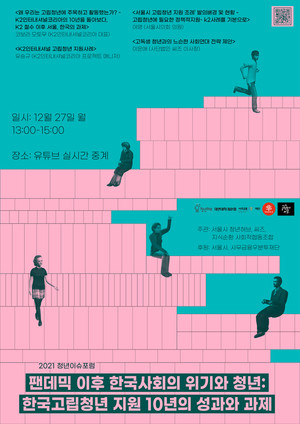 한국 고립 청년 문제의 해결 방안을 모색하는 온라인 포럼이 오는 27일 오후 1시 개최된다.서울시 청년허브, 사단법인 씨즈, 지식순환 사회적협동조합이 함께 주관하는 이번 포럼의 제목은 '한국사회의 위기와 청년: 한국 고립 청년 지원 10년의 성과와 과제'다.포럼은 서울시 은평구 서울혁신파크에서 개최되며, 코로나 상황에 따라 현장 참여 없이 유튜브로 실시간 중계될 예정이다.통계청의 2019년 조사 결과에 따르면 우리나라의 사회적 고립도는 경제협력개발기구(OECD) 평균(10%)의 약 3배(27.7%)에 달한다. 또 한국청소년정책연구원