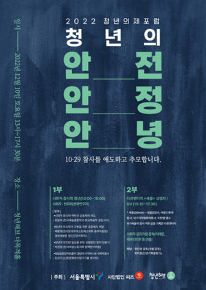 서울시 청년허브(이하 청년허브)와 사단법인 씨즈가 오는 10일 오후 1시 서울혁신파크 미래청에서 2022 청년의제포럼 '청년의 안전, 안정, 안녕'을 개최한다.이번 포럼은 10·29 참사 이후 청년들의 트라우마 극복을 위해 공동체의 역할과 사회적 참사를 다층적으로 이해하고 안전한 사회를 위한 대안을 모색하는 자리이다.이번 포럼에 앞서 청년허브는 사회적 참사에 대한 청년 당사자의 경험과 문제점을 진단하기 위해 청년 당사자 10인과 함께 '청년공론장: 참사를 마주한 우리의 이야기'를 진행한 바 있다. 해당 공론장의 참여자는 “하나의 방