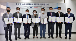 재단법인 한국중앙자원봉사센터는 환경부와 한국포장재재활용사업공제조합(이하 재활용공제조합), 식음료업체 5곳과 함께 자원순환 사회구축과 탄소중립 자원봉사 활동 활성화를 위한 업무협약을 체결했다.21일 광화문 한국중앙자원봉사센터에서 진행된 협약식에는 환경부와 재활용공제조합, 남양유업, 매일유업, 서울우유협동조합, 에치와이, 정식품 등 관계자 10여 명이 참석했다.이번 협약은 시민들의 자원봉사 활동 참여를 통해 매년 꾸준히 줄고 있는 종이팩 회수 재활용률을 높이기 위한 목적으로 마련됐다.중앙자원봉사센터는 이달 30일부터 전국 30여 개 자