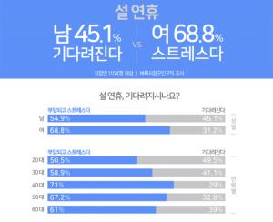 민족 최대의 명절, 설이 다가 오고 있다. 하지만 얇아지는 지갑과 강도 높은 가사노동, 가족 친지의 잔소리 등을 생각하면 설날이 마냥 즐겁지만은 않은 것 같다. 특히 성별, 연령별, 결혼 유무에 따라 설날에 대한 생각이 다른 것으로 조사됐다. 생활밀착형 일자리 정보를 제공하는 '벼룩시장구인구직'이 직장인 1154명을 대상으로 설 명절에 대한 설문조사를 진행한 결과 직장인 62.8%는 설 연휴가 '부담되고 스트레스다'라고 답했다. '기다려진다'고 응답한 사람은 37.2%에 불과했다. 성별,
