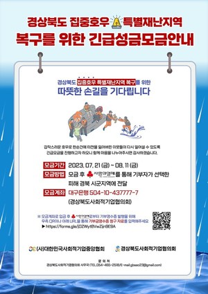 (사)대한민국사회기업중앙협회는 경상북도사회적기업협의회와 함께 경북 특별재난지역 복구를 위한 '긴급성금모금'을 진행한다.(사)대한민국사회적기업중앙협회와 경상북도사회적기업협의회는 광역지자체 중 이번 집중호우로 인명피해가 가장 큰(사망 25명, 실종 2명) 경북, 예천, 문경, 영주, 봉화 지역의 호우 피해 이웃을 돕기 위해 지난 21일부터 사회적기업과 관계기관을 대상으로 모금을 시작했다.모금 기간은 8월 11일까지이며, 모금 계좌는 대구은행 (504-10-437777-7, 경상북도사회적기업협의회)이다. 모금 후 모인 성금은 경북사회복지