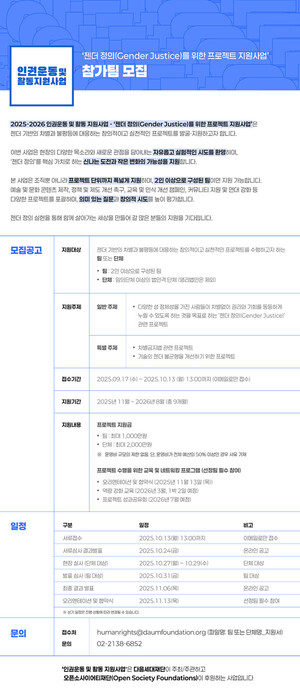 다음세대재단은 오픈소사이어티재단과 함께 2025-2026 인권운동 및 활동 지원사업 '젠더 정의(Gender Justice)를 위한 프로젝트 지원사업' 참가팀 모집을 시작했다고 밝혔다.이번 사업은 젠더 기반 차별과 불평등에 대응하는 창의적이고 실천적인 프로젝트를 발굴·지원함으로써 차별 없는 사회로의 변화를 모색하기 위해 마련됐다. 다음세대재단은 인권이 사회를 지탱하는 기본 가치임에도 불구하고, 인권 분야에 대한 사회적 지원은 다른 비영리 영역에 비해 부족하다는 문제의식 속에서 2020년부터 이 사업을 시작했으며, 올해로 세 번째를