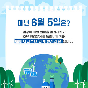 매년 6월 5일은 환경에 대한 관심을 환기시키고 주요 환경문제를 돌아보기 위해 UN에서 지정한 '세계 환경의 날'이다. 대한민국은 6월 5일을 법정기념일로 지정하고 1996년부터 기념행사를 개최하고 있다. 올해의 주제는 다.