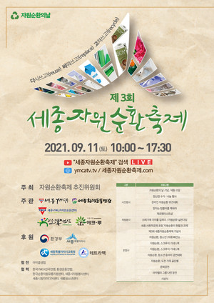 세종특별자치시가 오는 9월 11일 제13회 자원순환의 날을 기념해 '제3회 세종자원순환축제'를 온라인·비대면 방식으로 개최한다. 세종자원순환축제는 자원순환의 가치와 실천의 중요성을 알리기 위해 시와 시민, 환경단체가 손잡고 2019년 처음 시작해 올해로 3회째를 맞이했다. 제3회 세종자원순환축제는 세종YMCA, 세종환경운동연합, 세종YMCA자원순환센터, 마을과복지연구소, 마을기업 에코-루가 공동주최하고 테트라팩코리아의 후원으로 진행된다. 올해는 코로나19 확산방지를 위해 사전제작영상을 송출하거나 실시간 온라인 방송으로 진행된다. 시