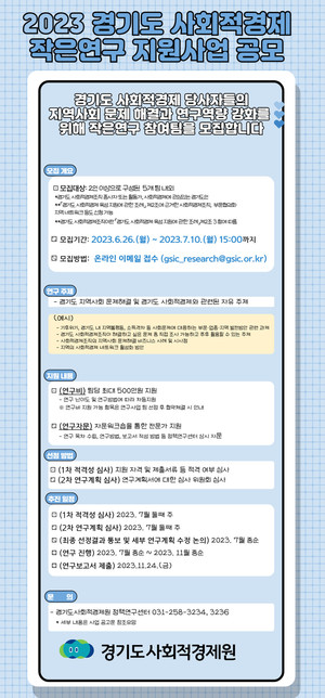 올해 3월 새롭게 출범한 경기도사회적경제원이 도내 사회적경제 당사자들의 지역사회 문제 해결을 지원하고, 기초연구 역량 강화를 돕기위해 「2023 경기도 사회적경제 작은연구 지원사업」을 실시 및 참여자를 모집한다고 밝혔다.본 사업은 경기도 사회적경제 조직 종사자 또는 활동가, 사회적경제에 관심 있는 경기도민이라면 누구나 지원 가능하며, 2인 이상 팀 단위로 신청할 수 있다.연구주제는 자유주제로 기후위기, 도내 지역 불평등, 소득격차 등 경기도 지역사회 문제해결 및 경기도 사회적경제와 관련된 연구라면 진행 가능하다.1차 서류심사는 적격