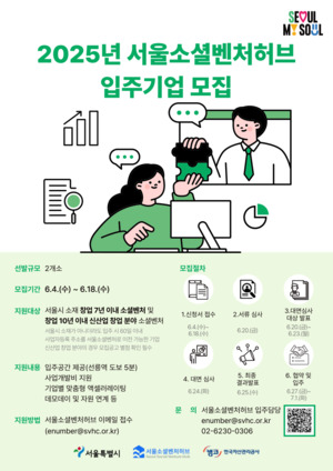 서울소셜벤처허브가 소셜임팩트 확산을 위한 소셜벤처 발굴 및 지원을 위해 입주기업 2곳을 새롭게 모집한다고 밝혔다. 접수 마감은 6월 18일까지다.모집 대상은 서울시 소재 창업 7년 이내 소셜벤처 및 창업 10년 이내 신산업 분야 소셜벤처로, 기술보증기금 소셜벤처스퀘어 소셜벤처기업 판별 결과 통지서를 보유한 기업이면 지원 가능하다.선정된 기업에는 서울소셜벤처허브 내 입주 공간이 제공되며, 입주 기간은 기본 2년이다. 이외에도 전문가 멘토링 및 투자 연계, 기업별 맞춤형 성장지원, 소셜벤처 생태계 협력 기회 등이 지원된다.모집에 대한