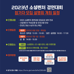 한국사회적기업진흥원은 2023년 소셜벤처 경연대회 참가자 모집 설명회를 개최한다. 설명회는 총 3회 진행되며 1, 2회차는 6월 22일에 서울시 성수동의 소셜캠퍼스온 서울1센터 8층 이벤트홀에서, 3회차는 7월 1일 부산 벡스코 컨벤션홀에서 열린다. 또한 온라인 한국사회적기업진흥원 Youtube 채널을 통해서도 생중계된다. 설명회에서는 ▲소셜벤처 경연대회 모집 요강 세부 안내 ▲사업제안서 작성 요령 및 유의 사항 ▲전년도 대상 수상자 미니 특강이 준비되어 있다. 더 자세한 내용은 운영사무국이나 카카오톡 채널에서 ‘2023 소셜벤처