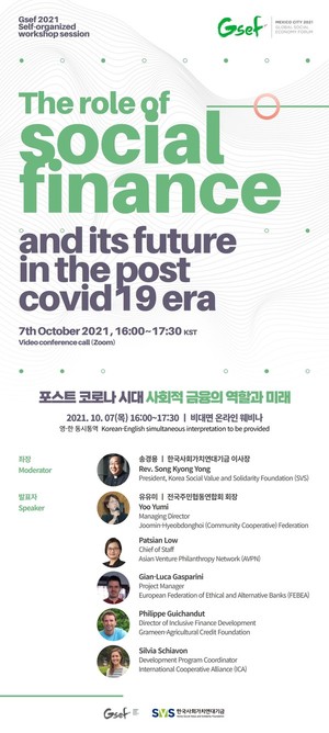 한국사회가치연대기금은 10월 7일(목) 오후 4시부터 사회적 경제 분야 시민사회 및 지방정부 네트워크인 국제사회적경제협의체(GSEF)의 2021 멕시코시티 포럼에서 '포스트 코로나 시대 사회적 금융의 역할과 미래'를 주제로 세션을 개최한다.코로나19 확산으로 인해 온라인으로 진행되는 이번 세션은 국제협동조합연맹(ICA: International Cooperative Alliance), 그라민재단(GCAF: Grameen Crédit-Agricole Foundation), 아시아벤처자선네트워크(AVPN: Asia Venture Phi