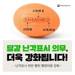 앞으로 달걀의 난각 표시를 위·변조하거나 미표시하는 경우 행정처분이 강화되며, 달걀의 난각에 산란일자, 생산자 고유번호, 사육환경번호 등을 반드시 표시해야 한다.식품의약품안전처(이하 식약처)는 12일 계란의 난각표시를 위·변조하거나 미표시하는 경우 행정처분을 강화하는 것을 내용으로 하는 '축산물 위생관리법 시행규칙' 일부 개정안을 입법예고했다. 또한 달걀 난각에 산란일자, 생산자 고유번호, 사육환경 번호 등을 표시하도록 하는'축산물의 표시기준' 일부 개정안을 행정예고했다.주요 내용은 ▲달걀의 난각표시를