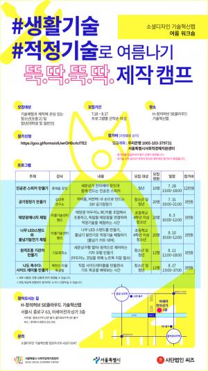 서울시사회적경제지원센터가 운영하는 소셜디자인 기술혁신랩이 오는 17일(금)까지 서울 종로구 아세아전자상가 3층 H-창의허브 SE클라우드 내에 위치한 소셜디자인 기술혁신랩에서 여름방학을 맞은 청소년과 청년들을 대상으로 여름 워크숍 '생활기술·적정기술로 여름나기 뚝딱뚝딱 제작 캠프'를 개최한다. 소셜디자인 기술혁신랩은 기술·제조, 사회서비스, IT 등 다양한 분야의 사회적경제 및 기술 장인과의 협업 기반을 조성하기 위한 공유 작업 공간이다. 서울 종로구 아세아전자상가 3층 내 약 40평 규모의 작업 공간과 CNC, 레이저