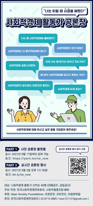 사단법인 한국사회적경제연대회의(이하 연대회의)와 사회적협동조합 빠띠는 사회적경제 정체성에 기반한 리더십의 형성과 사회적경제 내 문화를 조성하고 활동 환경을 개선하기 위해 활동가 공론장을 함께 기획·준비했다.공론장은 8월 19일 빠띠 믹스 온라인 플랫폼에서 시작되어 9월 2일까지 약 2주간 활동가들의 경험과 의견을 취합 한 뒤 9월 3일 오후 7시 30분부터 온라인(ZOOM)을 통해 실시간 공론장을 진행 할 예정이다.공론장은 활동가들이 현장에서 겪는 어려움이 있다면 어떤 어려움인지 확인하고, 이러한 환경을 어떻게 개선하고자 하는지를