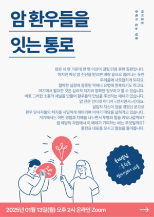 "암은 세 명 가운데 한 명 이상이 걸릴 만큼 흔한 질환입니다. 하지만 막상 암 진단을 받으면 벼랑 끝으로 밀려나는 듯한 두려움에 사로잡히게 되지요. 여기에서 필요한 것은 심리적 지지와 정확한 정보라고 할 수 있습니다."- 김찬호 라이프인 이사장 '푸른 뱀의 해' 을사년의 시작을 장식하는 '주제가 있는 대화'가 열린다.라이프인이 열일곱 번째 주제가 있는 대화 '암 환우들을 잇는 통로'를 오는 13일 오후 2시 온라인(Zoom)을 통해 개최한다. 주제가 있는 대화는 김찬호 라이프인 이사장이 진행하는 열린 강좌로, 주제에 관심 있는 누